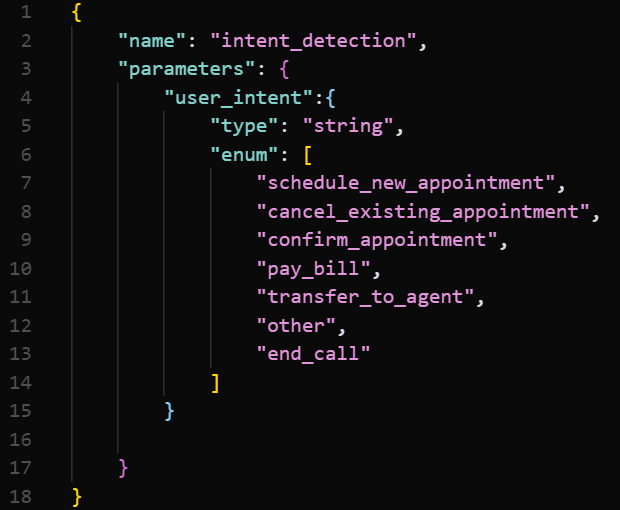 For example, for a medical use case we could include separate functions for scheduling an appointment, canceling an appointment, confirming an appointment, paying a bill, talking to a live agent, etc. But we recommend using one function, enumerating these options (example below).