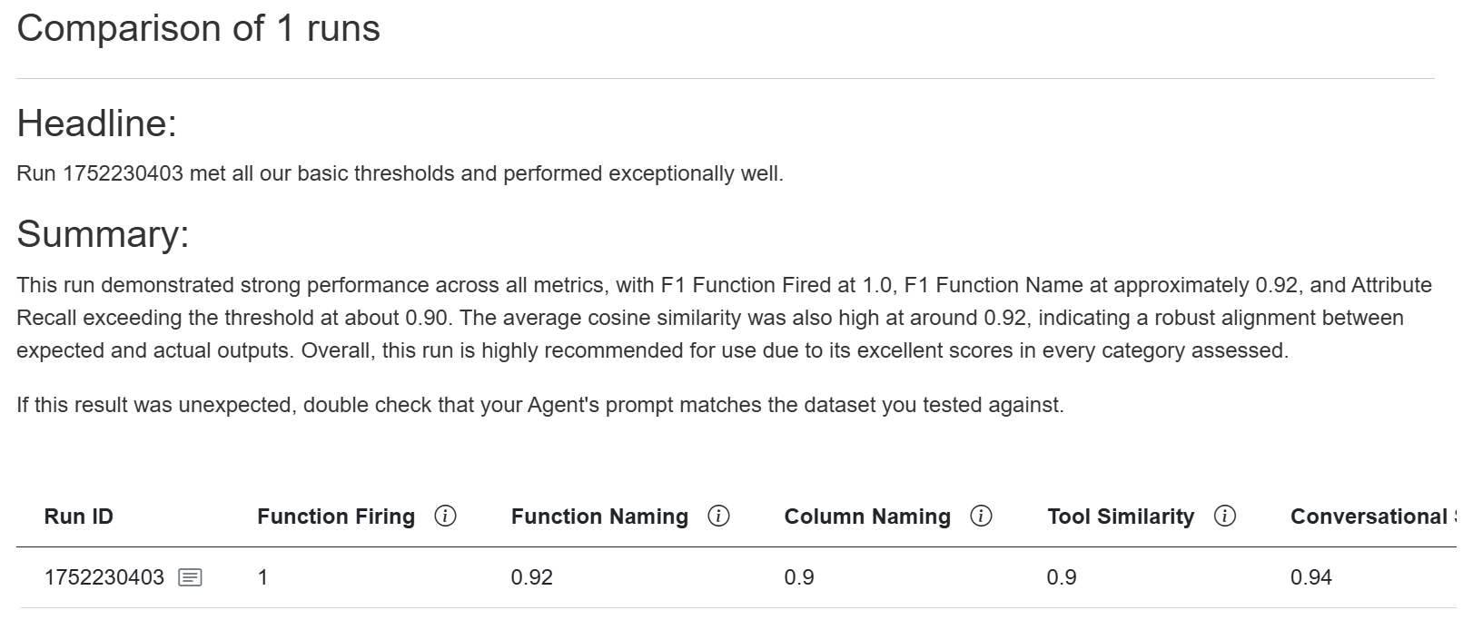 avg_cosine_similarity: The degree of similarity between the expected message and the message actually produced by the workflow.