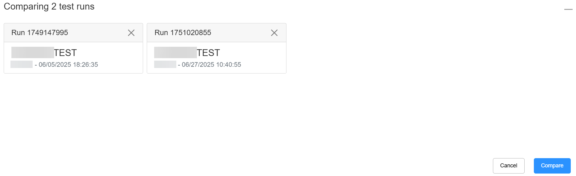 Click the Compare button, then select other runs to contrast two or more runs, or click the blue Compare button right away to only view metrics about one run.