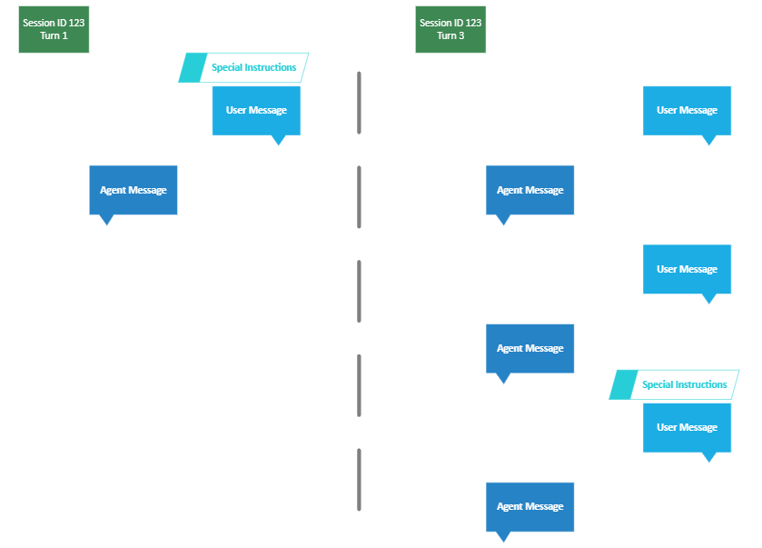 In the agent conversation chain, Special Instructions are added right before the user message. The Special Instructions are applied to the most recent user message (diagramed in the image below), and while the conversation progresses, your instructions aren’t attached to the prior messages.