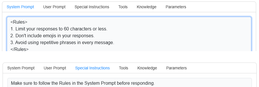 For an alternative solution, we recommend including a “Rules” section (in an XML tag) in your System Prompt and listing out the important instructions there, rather than in the Special Instructions. The, in the Special Instructions section, you can add one sentence referencing the “Rules” XML tag in the System Prompt.