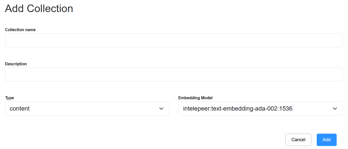 We recommend always using the Type “content” and Embedding Model “intelepeer: text-embedding-ada-002:1536”.