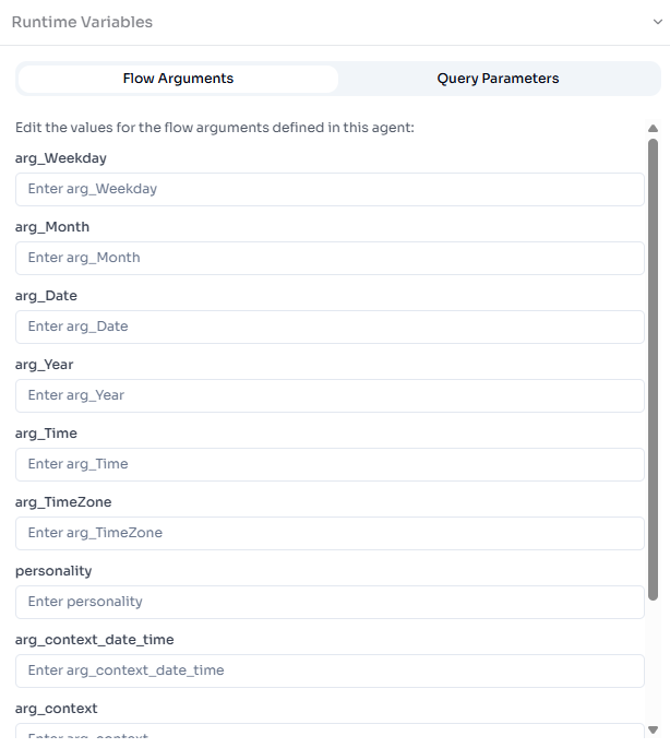 In the Runtime Variables section, you can add appropriate test data in the Flow Arguments tab or add a parameter in the Query Parameters tab.