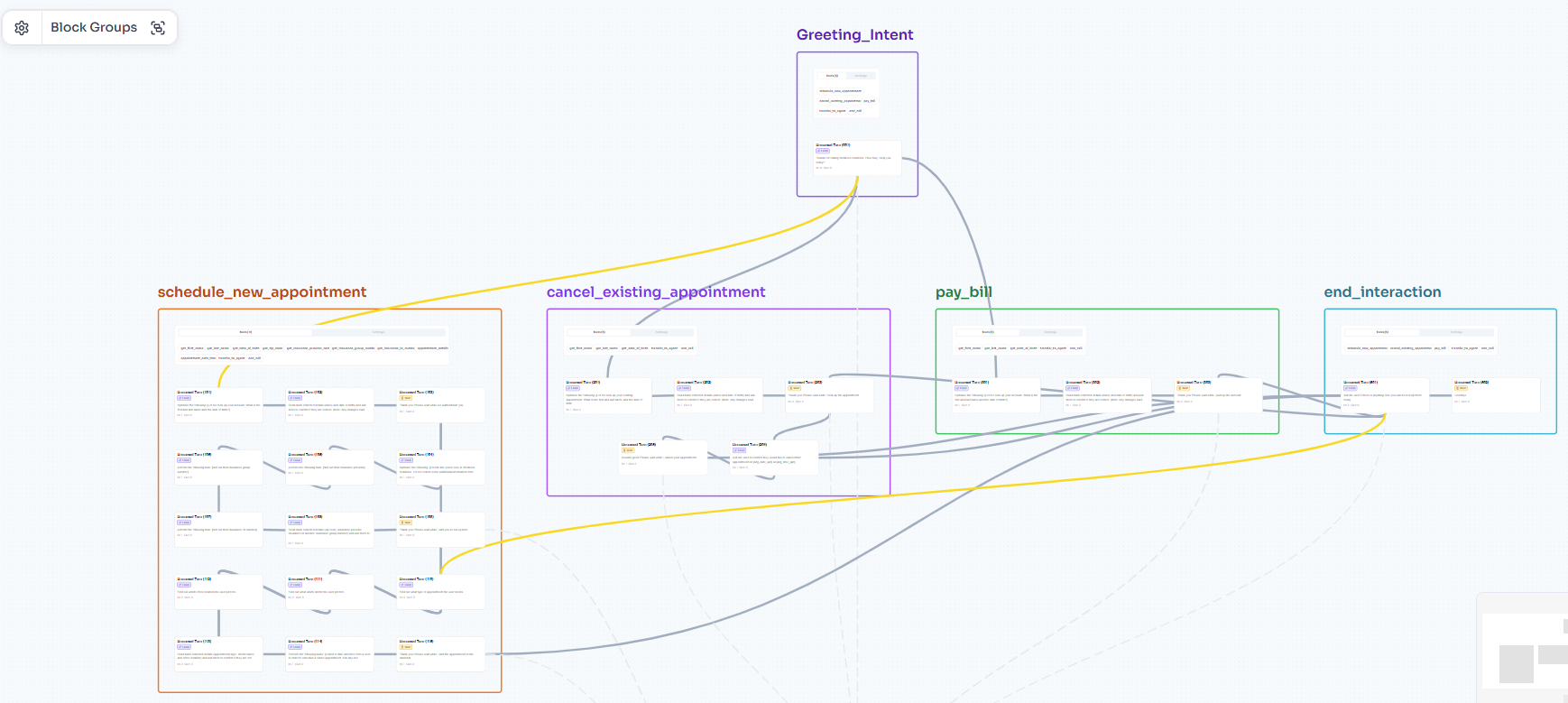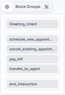 The Block Groups configuration reflects how your Blocks appear on the canvas. In our example above, we see the Greeting_Intent Block is on the top of the list and by itself. When we look at the canvas, that Block is visually at the top of the page and all the other blocks are below it.