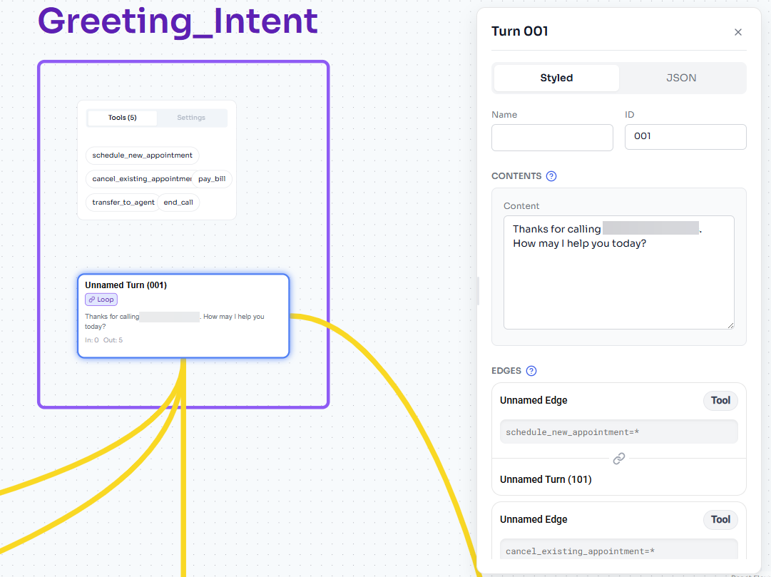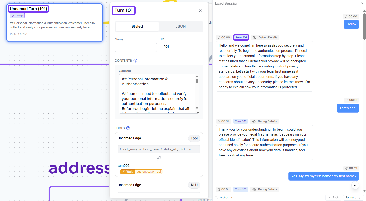 Note: When you’re exploring the agent elements on the canvas, if you notice something is incorrect or needs to be updated, you can go ahead and update some of those fields here (e.g., Block name; Turn name or content; Edge name, connect to value, or transition prompt). Just remember to click the Save Changes button at the top right-hand side of the screen