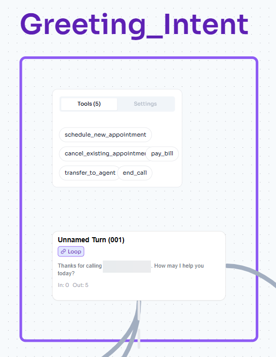 We recommend organizing your agent into logical sections. For a Block Agent that represents a full call, this would normally look like: