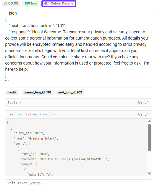 You can click Debug Details above the agent responses to get more details about what is happening behind the scenes of each message.