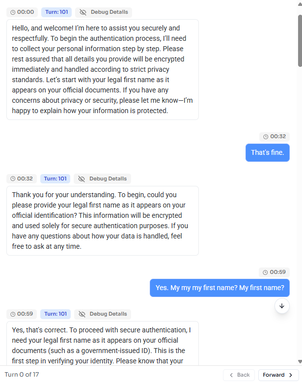 Here you can see a transcript of the full interaction, with timestamps and the relevant agent element (e.g., Turns) labeled.
