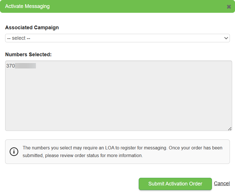 In the Activate Messaging pop-up, your selected number(s) appear and can be assigned to a campaign.