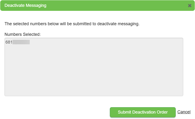 In the Deactivate Messaging pop-up, your selected number(s) appear before you confirm the update.