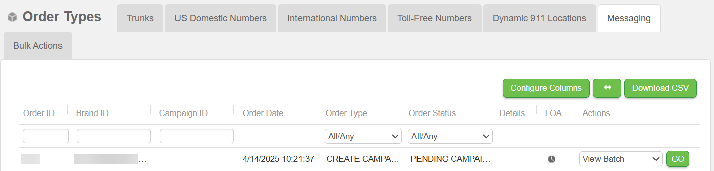 Click Configure Columns if you want to make changes to the table contents. Messaging column titles include SMS Status, MMS Status, Webhook, Brand ID, and Campaign ID.