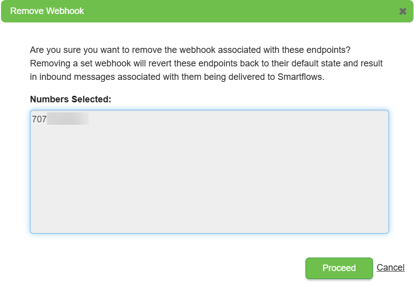 In the Remove Webhook pop-up, your selected number(s) appear before you confirm the update.