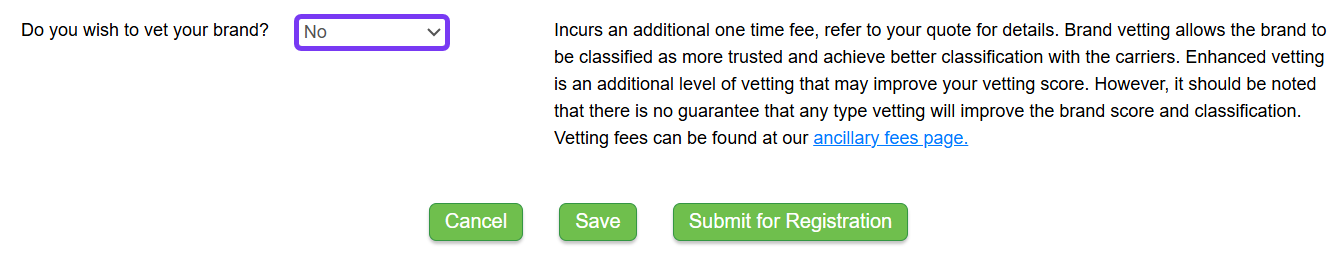 If you want your brand to be vetted, you can choose either standard or enhanced vetting. Brand vetting allows the brand to be classified as more trusted and achieve better classification with the carriers.