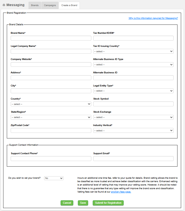 On the Messaging page, click the Brands tab. Above the My Brand table, click New Brand. The form appears. An asterisk (*) identifies the required fields.