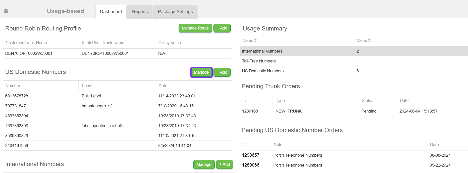 To manage numbers, in the appropriate section (for example, US Domestic Numbers or Toll-Free Numbers), click Manage. In the following example, a usage-based package was clicked, displaying the section for US Domestic Numbers.