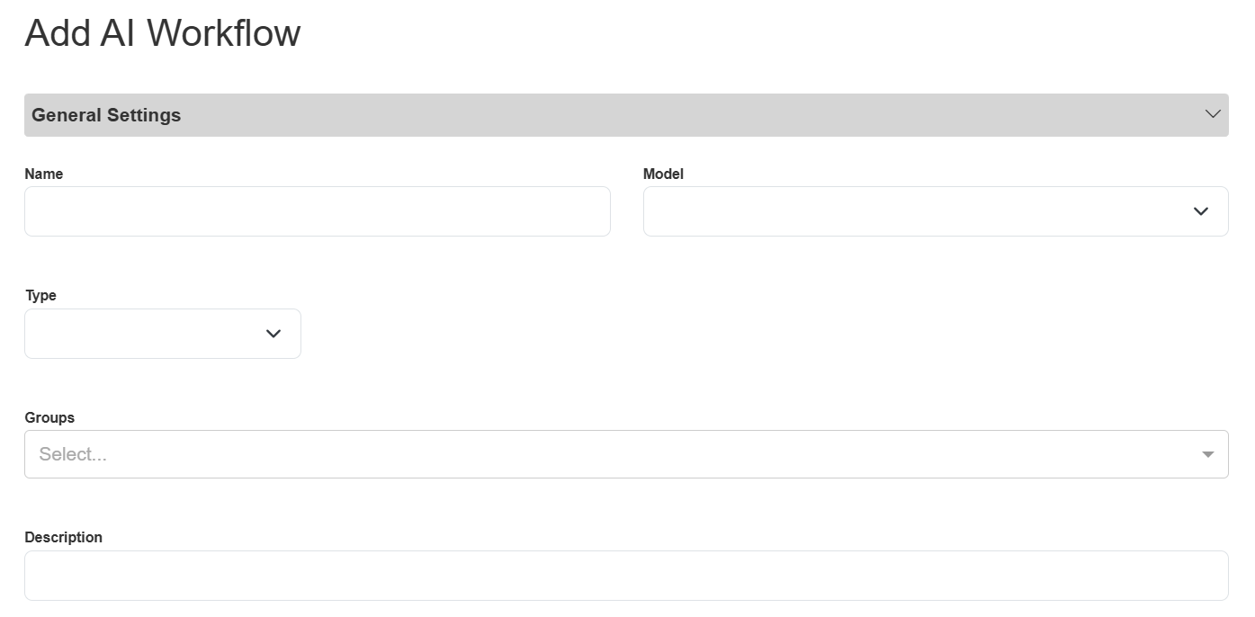 Click the Add button, to the right above the table. The Add AI Workflow pop-up appears.