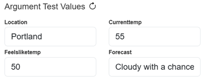 Note: If you want to test out different sample values, click the refresh button to the right of Argument Test Values after you enter new values. If you don’t refresh after changing those values, you will experience an error.