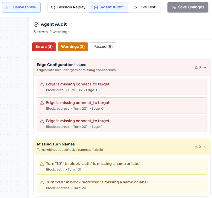 Note: When you’re exploring the agent elements on the canvas, if you notice something is incorrect or needs to be updated, you can go ahead and update some of those fields here (e.g., Block name; Turn name or content; Edge name, connect to value, or transition prompt). Just remember to click the Save Changes button at the top right-hand side of the screen