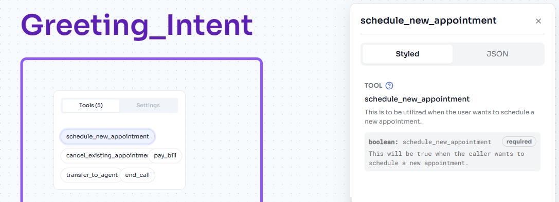Click on a Tool to view more information about the configurations (Styled tab) and the underlying JSON.