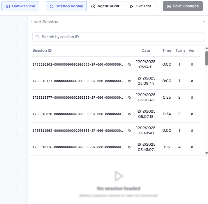 Click the Session Replay button at the top of the page to view previous interactions with your agent.