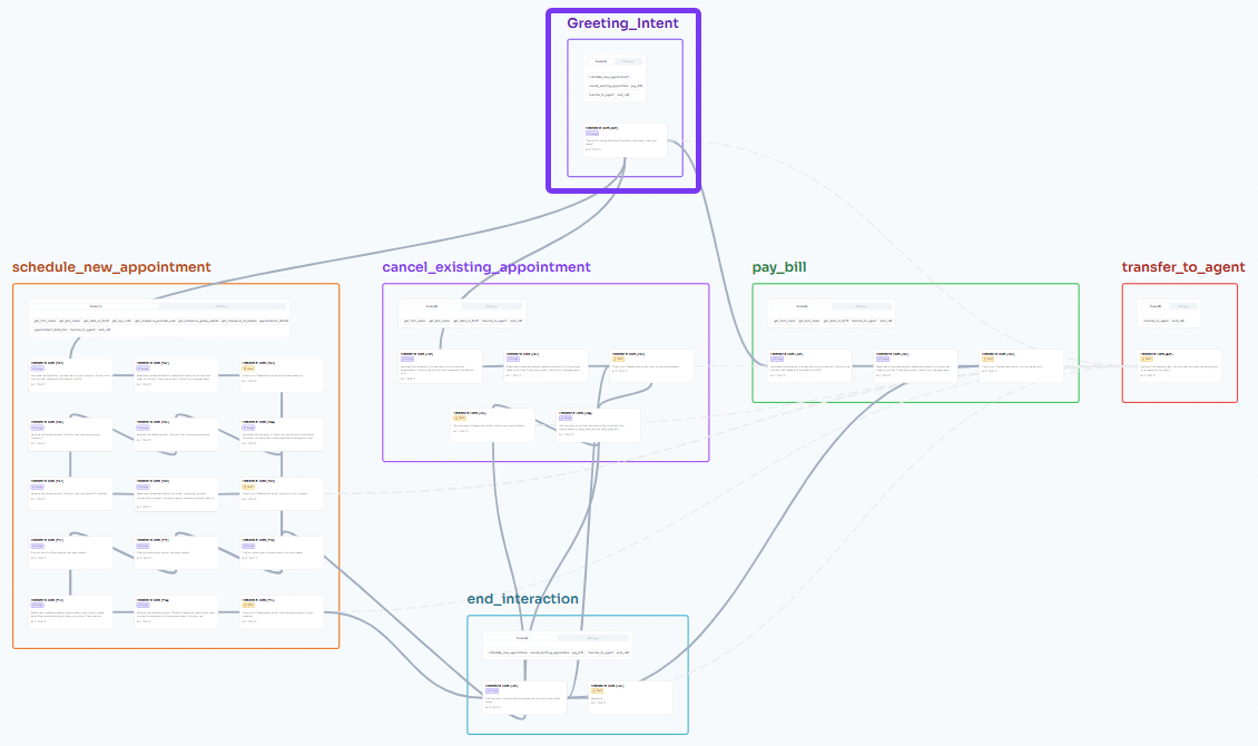 From the Canvas View, you can view all of the components of your agent at a high level, or dive deeper into the details of individual segments.