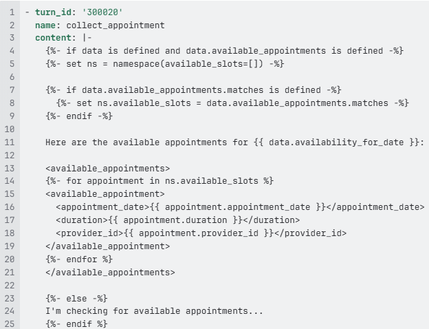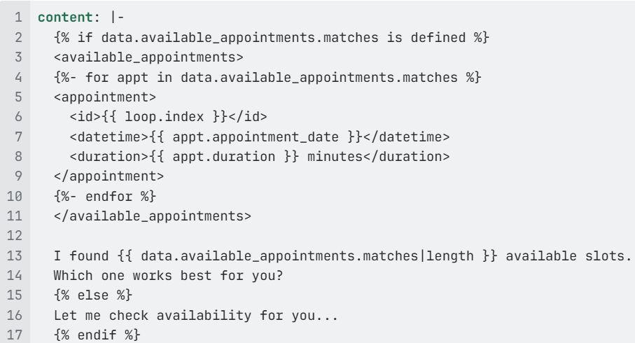 content: |- {% if data is not defined or data.available_appointments is not defined %} I'm still loading the available appointments... {% elif data.available_appointments.matches|length == 0 %} I couldn't find any available appointments for that date. {% else %} Here are your options: {# ... present appointments ... #} {% endif %} -