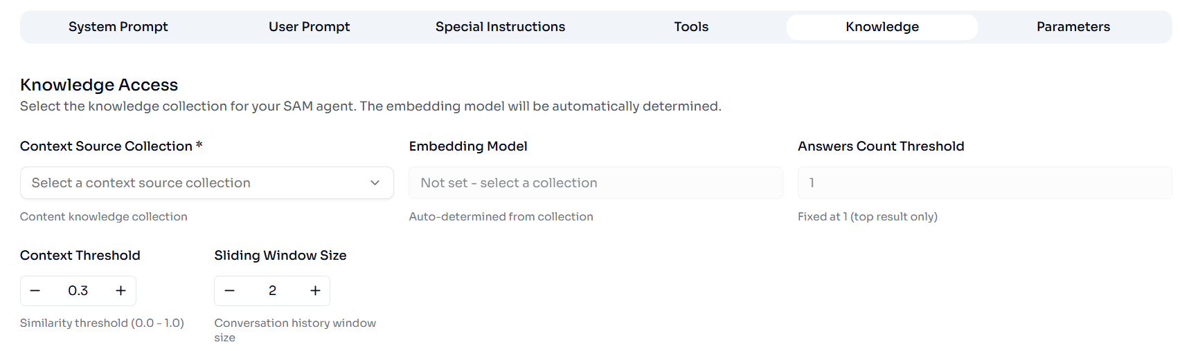 After your Knowledge Collection is in place, you’re ready to create a new SAM Agent:
