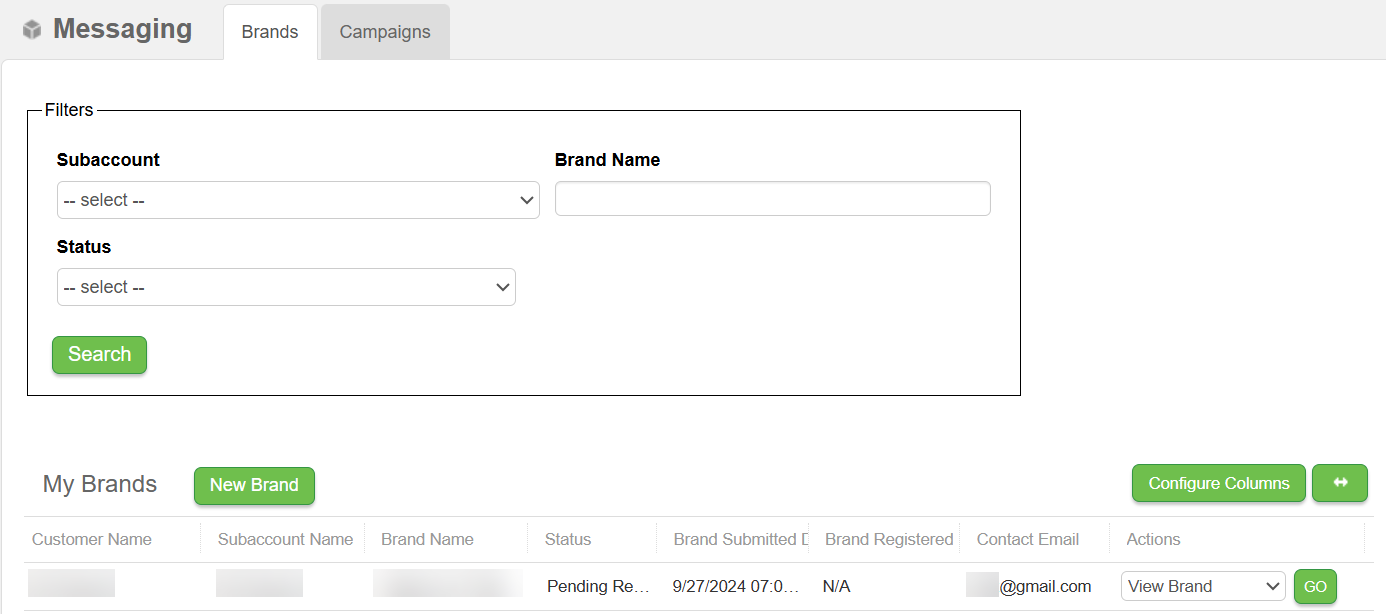 The Messaging page allows you to create new brands and campaigns, as well as view information and manage your brand and campaign capabilities. The page defaults to the Brands tab.