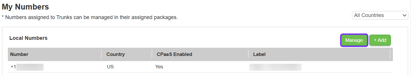 Click Manage in the appropriate section (e.g., Local (US Domestic) Numbers). The Manage Numbers page appears.