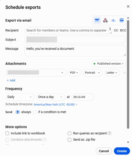 In the Attachments section, select the format you want for your export (e.g., .pdf, .png, .xls).