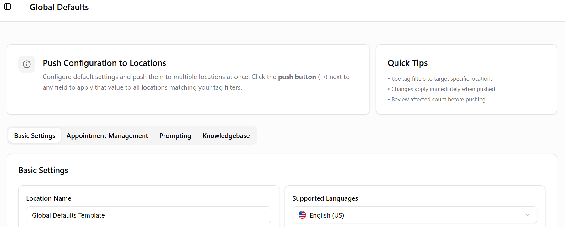 On the Global Defaults page you can create default configurations and push them to your locations.
